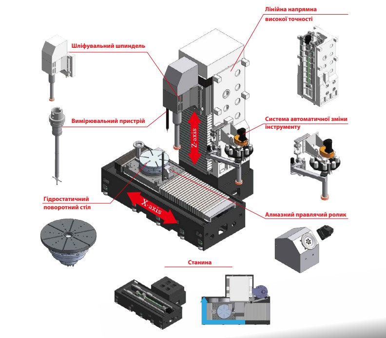 Однією з найважливіших конструктивних особливостей таких верстатів є вертикальне розташування шпинделя шліфувального круга. Порівняно з верстатами з горизонтальним розташуванням шпинделя таке компонування забезпечує зручніше базування та підтримку заготовок, спрощує операції завантаження заготовок і вивантаження деталей, а також дає змогу раціональніше використовувати виробничу площу.